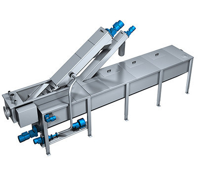 L'acqua che ha ancora prodotti solidi nelle più piccole dimensioni attraversa il chiarificatore. Le particelle sono sistemate entro tempo e uno screwconveyor orizzontale le trasporta al saltatore della raccolta.
